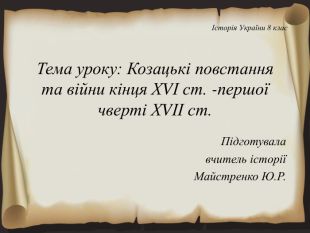 Тема уроку: Козацькі повстання та війни кінця ХVІ ст. -першої чверті ХVІІ ст. Підготувала вчитель історіїМайстренко Ю. Р.Історія України 8 клас
