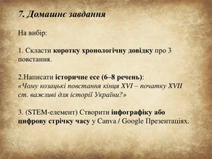 7. Домашнє завдання На вибір:1. Скласти коротку хронологічну довідку про 3 повстання.2. Написати історичне есе (6–8 речень):«Чому козацькі повстання кінця XVI – початку XVII ст. важливі для історії України?»3. (STEM-елемент) Створити інфографіку або цифрову стрічку часу у Canva / Google Презентаціях.