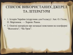 СПИСОК ВИКОРИСТАНИХ ДЖЕРЕЛ ТА ЛІТЕРАТУРИ1. Історія України (підручник для 8 класу) / Авт. О. Гісем, О. Мартинюк. — Харків: Ранок.2. Освітні матеріали про козацькі повстання на платформі “Всеосвіта”, “На Урок”.