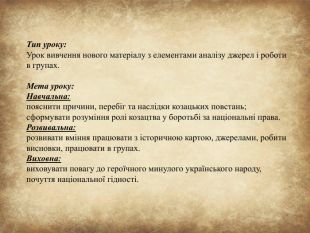 Тип уроку: Урок вивчення нового матеріалу з елементами аналізу джерел і роботи в групах. Мета уроку: Навчальна:пояснити причини, перебіг та наслідки козацьких повстань;сформувати розуміння ролі козацтва у боротьбі за національні права. Розвивальна:розвивати вміння працювати з історичною картою, джерелами, робити висновки, працювати в групах. Виховна:виховувати повагу до героїчного минулого українського народу, почуття національної гідності.