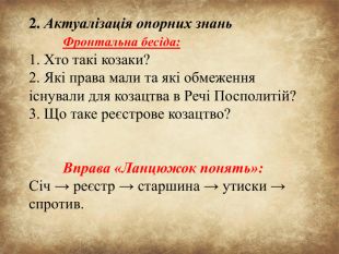 2. Актуалізація опорних знань Фронтальна бесіда:1. Хто такі козаки?2. Які права мали та які обмеження існували для козацтва в Речі Посполитій?3. Що таке реєстрове козацтво? Вправа «Ланцюжок понять»: Січ → реєстр → старшина → утиски → спротив.