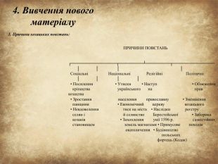 4. Вивчення нового матеріалу 1. Причини козацьких повстань: ПРИЧИНИ ПОВСТАНЬ ┌───────────────┬────────┴────────┬────────────── │ │ │ │ Соціальні Національні Релігійні Політичні │ │ │ │ • Посилення • Утиски • Наступ • Обмеження кріпацтва українського на прав козацтва • Зростання населення православну • Зменшення панщини • Економічний церкву козацького • Невдоволення тиск на міста • Наслідки реєстру селян і й селянство Берестейської • Заборона козаків • Захоплення унії 1596 р. самостійних становищем земель магнатами • Примусове походів окатоличення • Будівництво польських фортець (Кодак)