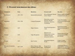 Повстання. Роки. Провідник. Основні подіїНаслідки. Косинського1591–1593 Криштоф Косинський. Бої на Київщині, Волині, облога Черкас. Перша спроба масового козацького виступу. Наливайка1594–1596 Северин Наливайко. Повстання охопило Поділля, Волинь, Київщину, битва під Солоницею. Страта Наливайка, посилення контролю над козаками. Жмайла1625 Марко Жмайло. Битва біля Курукового озера. Куруківська угода: збільшення реєстру до 6000 Трясила1630 Тарас Федорович. Перемога під Переяславом, козаки знищили частину польського війська. Переяславська угода: підтвердження 6000 реєстровців. Сулими1635Іван Сулима. Руйнування фортеці Кодак. Страта Сулими, відбудова Кодака. Павлюка, Острянина, Гуні1637–1638 Павло Павлюк, Яків Острянин, Дмитро Гуня. Великі бої на Лівобережжі«Ординація Війська Запорозького»: реєстр 6000, Січ під контролем 2. Основні повстання та війни: