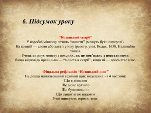 “Козацький скарб”У коробці/мішечку лежать “монети” (можуть бути паперові). На кожній — слово або дата з уроку (реєстр, унія, Кодак, 1630, Наливайко тощо). Учень витягує монету і пояснює, як це пов’язано з повстаннями. Якщо відповідь правильна — “монета в скарб”, якщо ні — допомагає клас. Фінальна рефлексія “Козацький щит”На дошці намальований великий щит, поділений на 4 частини: Що я дізнався. Що мене вразило. Що було складно. Що запам’ятаю надовго. Учні вписують короткі тези.6. Підсумок уроку