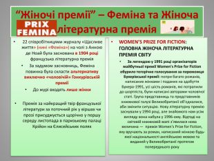 “Жіночі премії” – Феміна та Жіноча літературна премія 22 співробітницями журналу «Щасливе життя» (нині «Феміна») на чолі з Анною де Ноай була заснована в 1904 році французька літературна премія. За задумом засновниць, Феміна повинна була скласти альтернативу виключно «чоловічій» Гонкурівській преміїДо журі входять лише жінки. Премія за найкращий твір французької літератури за поточний рік у віршах чи прозі присуджується щорічно у першу середу листопада в паризькому палаці Крійон на Єлисейських полях. WOMEN’S PRIZE FOR FICTION: ГОЛОВНА ЖІНОЧА ЛІТЕРАТУРНА ПРЕМІЯ СВІТУЗа легендою у 1991 році організаторів майбутньої премії Women's Prize for Fiction обурило тогорічне голосування за переможця Букерівської премії: попри багато романів, написаних жінками і поданих на здобуття Букера-1991, усі шість романів, які потрапили до шортліста, були написані авторами чоловічої статі. Група представниць та представників книжкової галузі Великобританії об’єдналися, аби змінити ситуацію. Нову літературну премію заснували у 1994 році, але знайомого нам усім вигляду вона набула у 1996-ому. Відтоді на світовій книжковій мапі з’явилася нова величина — премія Women's Prize for Fiction, яку вручають за роман, написаний жінкою будь-якої національності англійською мовою та виданий у Великобританії протягом попереднього року