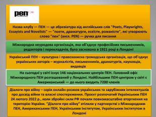 Назва клубу — ПЕН — це абревіатура від англійських слів "Poets, Playwrights, Essayists and Novelists" — "поети, драматурги, есеїсти, романісти", які утворюють слово "пен" (англ. PEN) — ручка для писання. Міжнародна неурядова організація, яка об'єднує професійних письменників, редакторів і перекладачів, була заснована в 1921 році в ЛондоніУкраїнський ПЕН – культурна і правозахисна громадська організація, що об'єднує українських авторів – журналістів, письменників, драматургів, науковців, видавців На сьогодні у світі існує 146 національних центрів ПЕН. Головний офіс Міжнародного ПЕН розташований у Лондоні. Найбільшим ПЕН-центром у світі є Американський — до нього входить 7200 членів. Діалоги про війну – серія онлайн-розмов українських та зарубіжних інтелектуалів про досвід війни та власні спостереження. Проєкт розпочатий Українським ПЕН 24 лютого 2022 р., коли збройні сили РФ почали повномасштабне вторгнення на територію України. “Діалоги про війну” втілили у партнерстві з Міжнародним ПЕН, Американським ПЕН, Українським Інститутом, Українським Інститутом в Лондоні