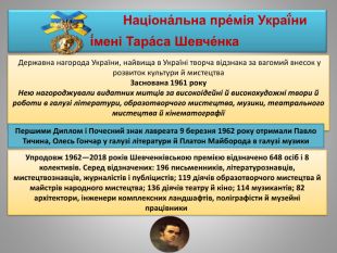 Націона́льна пре́мія Украї́ни і́мені Тара́са Шевче́нка Державна нагорода України, найвища в Україні творча відзнака за вагомий внесок у розвиток культури й мистецтва. Заснована 1961 року. Нею нагороджували видатних митців за високоідейні й високохудожні твори й роботи в галузі літератури, образотворчого мистецтва, музики, театрального мистецтва й кінематографіїПершими Диплом і Почесний знак лавреата 9 березня 1962 року отримали Павло Тичина, Олесь Гончар у галузі літератури й Платон Майборода в галузі музики. Упродовж 1962—2018 років Шевченківською премією відзначено 648 осіб і 8 колективів. Серед відзначених: 196 письменників, літературознавців, мистецтвознавців, журналістів і публіцистів; 119 діячів образотворчого мистецтва й майстрів народного мистецтва; 136 діячів театру й кіно; 114 музикантів; 82 архітектори, інженери комплексних ландшафтів, поліграфісти й музейні працівники