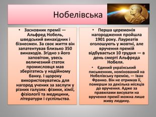 Нобелівська Перша церемонія нагородження пройшла 1901 року. Лауреатів оголошують у жовтні, але вручення премій відбувається 10 грудня — в день смерті Альфреда Нобеля. Єдиний український письменник, номінований на Нобелівську премію, — Іван Франко. Він не отримав її, померши за декілька місяців до вручення. Адже за правилами висувати на вручення премії можна лише живу людину. Засновник премії — Альфред Нобель, шведський винахідник і бізнесмен. За своє життя він запатентував близько 350 винаходів. Згідно з його заповітом, увесь величезний статок промисловця мав зберігатись у надійному банку. І щороку використовуватись для нагород учених за заслуги у різних галузях: фізики, хімії, фізіології та медицини, літератури і суспільства.
