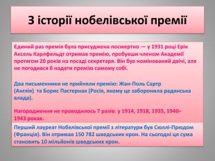 З історії нобелівської преміїЄдиний раз премія була присуджена посмертно — у 1931 році Ерік Аксель Карлфельдт отримав премію, пробувши членом Академії протягом 20 років на посаді секретаря. Він був номінований двічі, але не погодився б надати премію самому собі. Нагородження не проводилось 7 разів: у 1914, 1918, 1935, 1940–1943 роках. Два письменники не прийняли премію: Жан-Поль Сартр (Англія) та Борис Пастернак (Росія, якому це заборонила радянська влада). Перший лауреат Нобелівської премії з літератури був Сюллі-Прюдом (Франція). Він отримав 150 782 шведських крон. На сьогодні ця сума становить 10 мільйонів шведських крон.