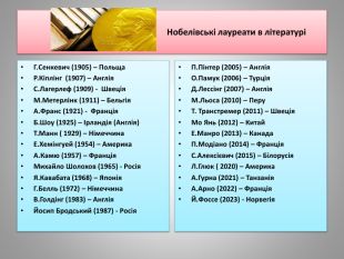 Нобелівські лауреати в літературіГ. Сенкевич (1905) – Польща. Р. Кіплінг (1907) – Англія. С. Лагерлеф (1909) - Швеція. М. Метерлінк (1911) – Бельгія. А. Франс (1921) - Франція. Б. Шоу (1925) – Ірландія (Англія)Т. Манн ( 1929) – Німеччина. Е. Хемінгуей (1954) – Америка. А. Камю (1957) – Франція. Михайло Шолохов (1965) - Росія. Я. Кавабата (1968) – Японія. Г. Белль (1972) – Німеччина. В. Голдінг (1983) – Англія. Йосип Бродський (1987) - Росія. П. Пінтер (2005) – Англія. О. Памук (2006) – Турція. Д. Лессінг (2007) – Англія. М. Льоса (2010) – Перу. Т. Транстремер (2011) – Швеція. Мо Янь (2012) – Китай. Е. Манро (2013) – Канада. П. Модіано (2014) – Франція. С. Алексієвич (2015) – Білорусія. Л. Глюк ( 2020) – Америка. А. Гурна (2021) – Танзанія. А. Арно (2022) – Франція. Й. Фоссе (2023) - Норвегія
