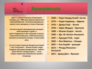 Букерівська. Одна із найпрестижніших літературних нагород, що з 1969 року щорічно вручається у Великій Британії. За 55 років Букерівська премія стала провідною в галузі літератури. Спочатку премія присуджувалася авторові, який проживає в одній із країн Співдружності або в Ірландії за роман, написаний англійською. З 2014 року можна висувати англомовних авторів і з інших країн світу. За всю історію існування Букерівської премії п'ять її власників — Вільям Ґолдінґ, Надін Гордімер, Від'ядхар Сураджпрасад, Найпол Джон Кутзее і Ішіґуро Кадзуо — стали згодом лауреатами Нобелівської премії з літератури1969 — Персі Говард Ньюбі- Англія1974 — Надін Гордімер, - Африка1976 — Девід Сторі - Англія1978 — Айріс Мердок – Британія1980 — Вільям Голдінг - Англія1983 — Дж. М. Кутзее–Австралія1997 — Арундаті Рой, - Індія2002 — Янн Мартель – Канада2007 — Енн Енрайт - Ірландія2014 — Річард Фленаґан – Австралія2021 – Давід Діоп - Франція