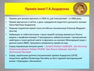 Премія імені Г. К. Андерсена Премію для авторів вручають із 1956-го, для ілюстраторів – із 1966 року. Премія вручається 2 квітня, в день народження видатного данського казкаря Ганса Крістіана Андерсена. Першим лауреатом премії стала англійська письменниця Елеонор Фарджон (Англія)Найвищою та найпочеснішою з трьох премій-нагород вважається Золота медаль з профілем казкаря. Її присуджують найвизначнішим і прогресивним майстрам у галузі дитячої книги та вручають на конгресі Міжнародної ради з дитячої книги (IBBY). Грошового еквіваленту премія не маєСеред переможців минулих років – Астрід Ліндґрен (ШВЕЦІЯ) , Еріх Кестнер (Німеччина),Джанні Родарі (ІТАЛІЯ), Туве Янссон (Швеція), Крістіна Нестлінгер (Австрія)Серед українських дитячих письменників премію Андерсена (1979) пощастило здобути Всеволоду Нестайку за його чудовий пригодницький роман «Тореадори з Васюківки»
