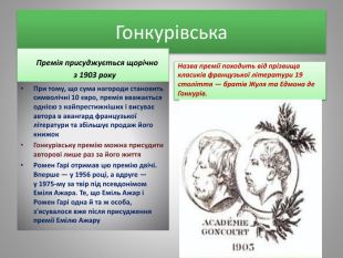 Гонкурівська Премія присуджується щорічно з 1903 року. При тому, що сума нагороди становить символічні 10 євро, премія вважається однією з найпрестижніших і висуває автора в авангард французької літератури та збільшує продаж його книжок. Гонкурівську премію можна присудити авторові лише раз за його життя. Ромен Гарі отримав цю премію двічі. Вперше — у 1956 році, а вдруге — у 1975-му за твір під псевдонімом Еміля Ажара. Те, що Еміль Ажар і Ромен Гарі одна й та ж особа, з'ясувалося вже після присудження премії Емілю Ажару. Назва премії походить від прізвища класиків французької літератури 19 століття — братів Жуля та Едмона де Гонкурів.