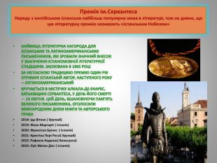 Премія ім. Сервантеса. Наряду з англійською іспанська найбільш популярна мова в літературі, тож не дивно, що цю літературну премію називають «іспанським Нобелем»Найвища літературна нагорода для іспанських та латиноамериканських письменників, які зробили значний внесок у збагачення іспаномовної літературної спадщини. Заснована в 1965 роціЗа негласною традицією премію один рік отримує іспанській автор, наступного року —латиноамериканський. Вручається в містечку Алкала-де-Енарес, батьківщині Сервантеса, у день його смерті — 23 квітня. Цей день, вшановуючи пам’ять великого письменника, оголосили Міжнародним днем книги та авторського права2018: Іда Вітале ( Уругвай)2019: Жоан Маргаріт ( Іспанія)2020: Франсіско Брінес ( Іспанія)2021: Кристіна Пері Россі( Уругвай)2022: Рафаель Каденас( Венесуела)2023: Луїс Матео Дієс ( Іспанія)