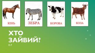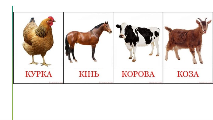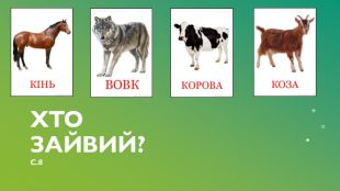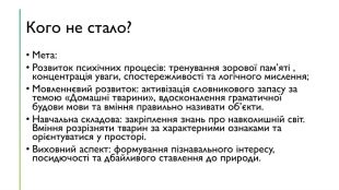 Кого не стало?Мета: Розвиток психічних процесів: тренування зорової пам’яті , концентрація уваги, спостережливості та логічного мислення;Мовленнєвий розвиток: активізація словникового запасу за темою «Домашні тварини», вдосконалення граматичної будови мови та вміння правильно називати об’єкти. Навчальна складова: закріплення знань про навколишній світ. Вміння розрізняти тварин за характерними ознаками та орієнтуватися у просторі. Виховний аспект: формування пізнавального інтересу, посидючості та дбайливого ставлення до природи.