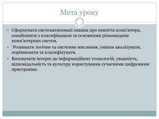 Мета уроку. Сформувати систематизовані знання про поняття комп'ютера, ознайомити з класифікацією та основними різновидами комп'ютерних систем. Розвивати логічне та системне мислення, уміння аналізувати, порівнювати та класифікувати. Виховувати інтерес до інформаційних технологій, уважність, відповідальність та культуру користування сучасними цифровими пристроями.