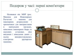 Подорож у часі: перші комп'ютери. Називався він МИР (рос. Машина для Инженерных Расчетов) - машина для інженерних розрахунків) і призначався для використання в навчальних закладах, невеликих інженерних бюро та наукових установах. Для введення і виведення даних у ньому використовувалась електрична друкарська машинка.