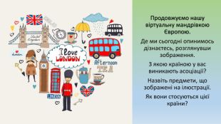 Продовжуємо нашу віртуальну мандрівкою Європою. Де ми сьогодні опинимось дізнаєтесь, розглянувши зображення. З якою країною у вас виникають асоціації? Назвіть предмети, що зображені на ілюстрації. Як вони стосуються цієї країни?