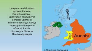 Це одна з найбільших держав Європи. Офіційна назва – Сполучене Королівство Великої Британії і Північної Ірландії. Склад території – 4 історичні області: Англія, Шотландія, Уельс та Північна Ірландія