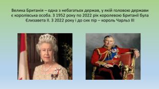 Велика Британія – одна з небагатьох держав, у якій головою держави є королівська особа. З 1952 року по 2022 рік королевою Британії була Єлизавета ІІ. З 2022 року і до сих пір – король Чарльз ІІІ