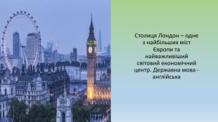 Столиця Лондон – одне з найбільших міст Європи та найважливіший світовий економічний центр. Державна мова - англійська