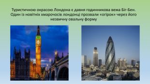 Туристичною окрасою Лондона є давня годинникова вежа Біг-Бен. Один із новітніх хмарочосів лондонці прозвали «огірок» через його незвичну овальну форму