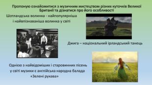 Пропоную ознайомитися з музичним мистецтвом різних куточків Великої Британії та дізнатися про його особливості Шотландська волинка - найпопулярніша і найвпізнаваніша волинка у світі Джига – національний ірландський танець Однією з найвідоміших і старовинних пісень у світі музики є англійська народна балада «Зелені рукава»