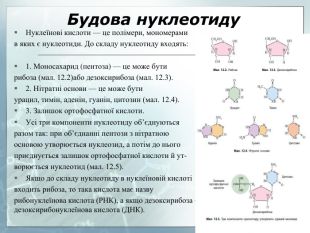 Будова нуклеотиду. Нуклеїнові кислоти — це полімери, мономерами в яких є нуклеотиди. До складу нуклеотиду входять:1. Моносахарид (пентоза) — це може бути рибоза (мал. 12.2)або дезоксирибоза (мал. 12.3).2. Нітратні основи — це може бути урацил, тимін, аденін, гуанін, цитозин (мал. 12.4).3. Залишок ортофосфатної кислоти. Усі три компоненти нуклеотиду об’єднуються разом так: при об’єднанні пентози з нітратною основою утворюється нуклеозид, а потім до нього приєднується залишок ортофосфатної кислоти й ут-ворюється нуклеотид (мал. 12.5). Якщо до складу нуклеотиду в нуклеїновій кислотівходить рибоза, то така кислота має назву рибонуклеїнова кислота (РНК), а якщо дезоксирибоза — дезоксирибонуклеїнова кислота (ДНК).