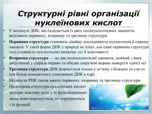 Структурні рівні організаціїнуклеїнових кислот. У молекулі ДНК, що складається із двох полінуклеотидних ланцюгів, виділяють первинну, вторинну та третинну структури. Первинна структура становить лінійну послідовність нуклеотидів в одному ланцюзі. У такій формі ДНК у природі не існує, але саме первинна структура (послідовність нуклеотидів) визначає усі її властивості. Вторинна структура — це два полінуклеотидні ланцюги, кожний з яких закручений у спіраль вправо та обидва закручені вправо навкруги однієї осі. Третинна структура ДНК формується тільки у зв’язку з білками та слугує для більш компактного упакування ДНК в ядрі. Молекули РНК також мають первинну, вторинну та третинну структури. Просторова структура нуклеїнових кислот відіграє важливу роль у їх функціонуванні: якщо вона порушується, то порушуються і їх функції.