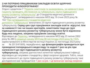 2.ЧИ ПОТРІБНО ПРАЦІВНИКАМ ЗАКЛАДІВ ОСВІТИ ЩОРІЧНО ПРОХОДИТИ ФЛЮОРОГРАФІЮ? Згідно з додатком 7 “Перелік симптомів та захворювань, за наявності яких пацієнту проводять обстеження на туберкульоз, групи підвищеного ризику розвитку туберкульозу” до Стандартів медичної допомоги “Туберкульоз”, затвердженого наказом МОЗ від 19 січня 2023 року № 102 “Про затвердження стандартів медичної допомоги “Туберкульоз” визначено 23 групи підвищеного ризику розвитку туберкульозу. Серед цих груп працівники закладів освіти відсутні. Але за наявності тих чи інших критеріїв, симптомів тощо до груп підвищеного ризику розвитку туберкульозу може бути віднесена будь-яка людина, зокрема працівник закладу освіти. Відповідно до Переліку, затвердженого наказом МОЗ від 23 липня 2002 року № 280 (у редакції наказу МОЗ від 08 листопада 2023 року № 1925, зареєстрованого в Міністерстві юстиції України 22 листопада 2023 року за № 2013/41069), передбачено, що флюорографія проводиться при проведенні попереднього медогляду та надалі 1 раз на рік при належності до груп підвищеного ризику розвитку туберкульозу, зокрема діагностики латентної туберкульозної інфекції, відповідно до галузевих стандартів у сфері охорони здоров’я. Тобто, лише при належності до групи підвищеного ризику розвитку туберкульозу таке дослідження має проводитися 1 раз на рік. І це визначає заклад охорони здоров’я.