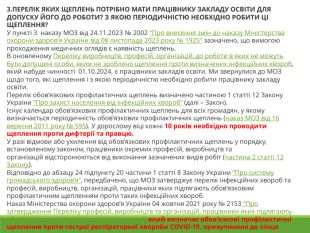 3.ПЕРЕЛІК ЯКИХ ЩЕПЛЕНЬ ПОТРІБНО МАТИ ПРАЦІВНИКУ ЗАКЛАДУ ОСВІТИ ДЛЯ ДОПУСКУ ЙОГО ДО РОБОТИ? З ЯКОЮ ПЕРІОДИЧНІСТЮ НЕОБХІДНО РОБИТИ ЦІ ЩЕПЛЕННЯ? У пункті 3 наказу МОЗ від 24.11.2023 № 2002 “Про внесення змін до наказу Міністерства охорони здоров’я України від 08 листопада 2023 року № 1925” зазначено, що вимогою проходження медичних оглядів є наявність щеплень. В оновленому Переліку виробництв, професій, організацій, до роботи в яких не можуть бути допущені особи, яким не зроблено щеплення проти визначених інфекційних хвороб, який набуде чинності 01.10.2024, є працівники закладів освіти. Ми звернулися до МОЗ щодо того, які щеплення і з якою періодичністю необхідно робити працівнику закладу освіти. Перелік обов’язкових профілактичних щеплень визначено частиною 1 статті 12 Закону України “Про захист населення від інфекційних хвороб” (далі – Закон). Існує календар обов’язкових профілактичних щеплень для всіх громадян, у якому визначається періодичність обов’язкових профілактичних щеплень (наказ МОЗ від 16 вересня 2011 року № 595). У дорослому віці кожні 10 років необхідно проводити щеплення проти дифтерії та правцю. У разі відмови або ухилення від обов’язкових профілактичних щеплень у порядку, встановленому законом, працівники окремих професій, виробництв та організацій відсторонюються від виконання зазначених видів робіт (частина 2 статті 12 Закону). Відповідно до абзацу 24 підпункту 20 частини 1 статті 8 Закону України “Про систему громадського здоров’я”, передбачено, що МОЗ затверджує перелік інфекційних хвороб та професій, виробництв, організацій, працівники яких підлягають обов’язковим профілактичним щепленням проти таких інфекційних хвороб. Наказ Міністерства охорони здоров’я України 04 жовтня 2021 року № 2153 “Про затвердження Переліку професій, виробництв та організацій, працівники яких підлягають обов’язковим профілактичним щепленням”, який визначає обов’язкові профілактичні щеплення проти гострої респіраторної хвороби COVID-19, призупинено до кінця воєнного стану.