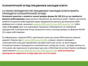 ПСИХІАТРИЧНИЙ ОГЛЯД ПРАЦІВНИКІВ ЗАКЛАДІВ ОСВІТИ 4.З ЯКОЮ ПЕРІОДИЧНІСТЮ ПРАЦІВНИКИ ЗАКЛАДІВ ОСВІТИ МАЮТЬ ПРОХОДИТИ ПСИХІАТРИЧНИЙ ОГЛЯД? Основною вимогою є наявність чинної довідки форми № 100-2/о на час прийняття рішення роботодавцем щодо допуску працівника до виконання робіт. Термін наступного прийняття рішення роботодавцем щодо продовження допуску до виконання робіт відбувається у строки, визначені наказом МОЗ від 26 січня 2024 року № 139, тобто через п’ять років. Для чого відповідно працівник спрямовується на повторний періодичний психіатричний огляд, результати якого у вигляді довідки за формою №100-2/о надає роботодавцю. За інформацією, наданою МОЗ, підготовлені зміни до наказу Міністерства охорони здоров’я України від 23 липня 2002 року № 280, у якому є вимога проходити психіатричний огляд для працівників закладів освіти раз на рік. Ці зміни будуть стосуватися вимоги проходження психіатричного огляду раз на рік, і це буде змінено на п’ять років. До підписання та реєстрації цих змін в Міністерстві юстиції України необхідно користуватися наказом МОЗ від 26 січня 2024 року № 139, який регламентує проходження медичного огляду один раз на п’ять років.