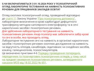5.ЧИ ВКЛЮЧАТИМЕТЬСЯ З 01.10.2024 РОКУ У ПСИХІАТРИЧНИЙ ОГЛЯД ЛАБОРАТОРНЕ ТЕСТУВАННЯ НА НАЯВНІСТЬ ПСИХОАКТИВНИХ РЕЧОВИН ДЛЯ ПРАЦІВНИКІВ ЗАКЛАДІВ ОСВІТИ? Огляд охоплює психіатричний огляд, проведений відповідно до статті 11 Закону України “Про психіатричну допомогу”, лабораторне визначення в крові карбогідрат-дефіцитного трансферину методом капілярного електрофорезу та в сечі наркотичних засобів і психотропних речовин. Для здійснення лабораторного тестування на наявність психоактивних речовин лікар-психіатр має забезпечити забір крові та сечі в особи, яка проходить огляд. Лабораторне тестування сечі на наявність в організмі наркотичних засобів і психотропних речовин охоплює дослідження на наявність чи відсутність опіоїдів, канабіоїдів, седативних чи снодійних засобів, кокаїну, галюциногенів, психостимуляторів. Це визначено пунктами 4-6 Порядку проведення попередніх, періодичних та позачергових психіатричних оглядів, у тому числі на предмет вживання психоактивних речовин, затвердженого наказом МОЗ від 18.02.2022 № 651.