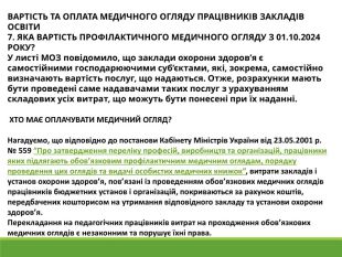 ВАРТІСТЬ ТА ОПЛАТА МЕДИЧНОГО ОГЛЯДУ ПРАЦІВНИКІВ ЗАКЛАДІВ ОСВІТИ 7. ЯКА ВАРТІСТЬ ПРОФІЛАКТИЧНОГО МЕДИЧНОГО ОГЛЯДУ З 01.10.2024 РОКУ? У листі МОЗ повідомило, що заклади охорони здоров’я є самостійними господарюючими суб’єктами, які, зокрема, самостійно визначають вартість послуг, що надаються. Отже, розрахунки мають бути проведені саме надавачами таких послуг з урахуванням складових усіх витрат, що можуть бути понесені при їх наданні. ХТО МАЄ ОПЛАЧУВАТИ МЕДИЧНИЙ ОГЛЯД? Нагадуємо, що відповідно до постанови Кабінету Міністрів України від 23.05.2001 р. № 559 “Про затвердження переліку професій, виробництв та організацій, працівники яких підлягають обов’язковим профілактичним медичним оглядам, порядку проведення цих оглядів та видачі особистих медичних книжок”, витрати закладів і установ охорони здоров’я, пов’язані із проведенням обов’язкових медичних оглядів працівників бюджетних установ і організацій, покриваються за рахунок коштів, передбачених кошторисом на утримання відповідного закладу та установи охорони здоров’я. Перекладання на педагогічних працівників витрат на проходження обов’язкових медичних оглядів є незаконним та порушує їхні права.