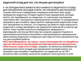 МЕДИЧНИЙ ОГЛЯД ДЛЯ ТИХ, ХТО ПРАЦЮЄ ДИСТАНЦІЙНО 8. ЧИ ПЕРЕДБАЧАЮТЬ ВИМОГИ МОЗ НАЯВНІСТЬ МЕДИЧНОГО ОГЛЯДУ ДЛЯ ПРАЦІВНИКІВ ЗАКЛАДІВ ОСВІТИ, ЯКІ ПРАЦЮЮТЬ ДИСТАНЦІЙНО? Служба освітнього омбудсмена ініціювала внесення змін щодо проведення медичних оглядів педагогічних працівників закладів освіти, які перебувають за кордоном, на тимчасово окупованих територіях або є внутрішньо переміщеними особами та продовжують працювати дистанційно. Адже пройти періодичний медичний огляд такі працівники не можуть. А їх недопуск до роботи через відсутність медичного огляду призводить до порушення прав дітей на доступ до освіти. Тому Служба освітнього омбудсмена звернулася з відповідним листом до Міністерства охорони здоров’я України із пропозицією розглянути можливість відтермінування проходження обов’язкових медичних оглядів для цих педагогічних працівників під час дистанційної роботи. МОЗ проінформувало, що наразі, чинне законодавство не передбачає підстав звільнення від проходження/відтермінування проходження обов’язкових медичних оглядів, зокрема, не визначає особливостей проходження таких оглядів для працівників закладів освіти, які працюють дистанційно і перебувають за кордоном чи на ТОТ і внесення змін потребує залучення широкого кола органів та осіб.