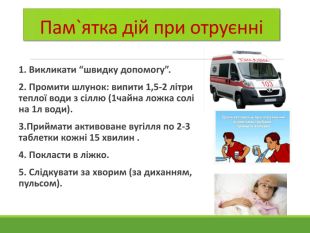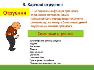 – це порушення функцій організму, спричинене потраплянням з навколишнього середовища токсичних речовин, що не можуть бути знешкоджені внутрішніми силами організму. Отруєння Симптоми отруєння Дискомфорт в ділянці шлунка Нудота Блювання Діарея Біль в животі Слабкість Головний біль Прискорене серцебиття Підвищення температури тіла 3. Харчові отруєння.