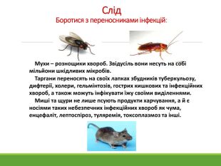 Слід Боротися з переносниками інфекцій: Мухи – рознощики хвороб. Звідусіль вони несуть на собі мільйони шкідливих мікробів. Таргани переносять на своїх лапках збудників туберкульозу, дифтерії, холери, гельмінтозів, гострих кишкових та інфекційних хвороб, а також можуть інфікувати їжу своїми виділеннями. Миші та щури не лише псують продукти харчування, а й є носіями таких небезпечних інфекційних хвороб як чума, енцефаліт, лептоспіроз, туляремія, токсоплазмоз та інші.