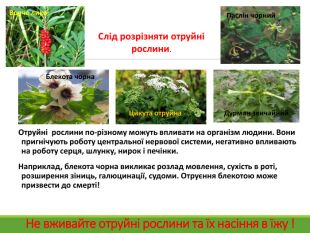 Отруйні рослини по-різному можуть впливати на організм людини. Вони пригнічують роботу центральної нервової системи, негативно впливають на роботу серця, шлунку, нирок і печінки. Наприклад, блекота чорна викликає розлад мовлення, сухість в роті, розширення зіниць, галюцинації, судоми. Отруєння блекотою може призвести до смерті! Не вживайте отруйні рослини та їх насіння в їжу ! Блекота чорна Дурман звичайний Слід розрізняти отруйні рослини. Цикута отруйна Вовче лико Паслін чорний