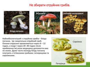 Найнебезпечніший з отруйних грибів – бліда поганка. Це смертельно отруйний гриб. Ознаки отруєння проявляються через 8 – 12 годин, а іноді і через 20 -40 годин після приймання їжі,коли медицина допомогти вже не може. Дуже часто молоду бліду поганку плутають з їстівнними грибами: печерицями та сироїжками. Не збирати отруйних грибів. Сироїжка Печериця Бліда поганка Мухомор Опеньки несправжні