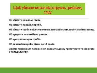 НЕ збирати невідомі гриби. НЕ збирати перезрілі гриби. НЕ збирати гриби поблизу великих автомобільних доріг та сміттєзвалищ. НЕ купувати на стихійних ринках. НЕ куштувати сирих грибів. НЕ давати їсти гриби дітям до 12 років. Зібрані гриби після повернення додому відразу приготувати та зберігати в холодильнику. Щоб убезпечитися від отруєнь грибами, слід: