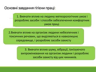 Основні завдання гігієни праці: 1. Вивчати вплив на людину метеорологічних умов і розробляє засоби і способи забезпечення комфортних умов праці. 2.Вивчати вплив на організм людини небезпечних і токсичних речовин, що виділяються в навколишнє середовище, і розробляє засоби захисту 3. Вивчати вплив шуму, вібрації, іонізуючого випромінювання на організм людини і розробляє засоби захисту від цих чинників.