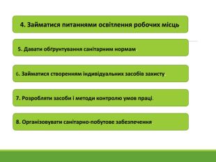 1.Поняття та основні завдання гігієни праці Згідно зі ст.7 Закону України «Про забезпечення санітарного й епідеміологічного благополуччя населення», завданням адміністрації є розробка і проведення санітарних і протиепідеміологічних заходів, здійснення контролю за підтримкою вимог санітарних норм та інформування органів державної санітарної епідеміологічної служби про надзвичайні ситуації.