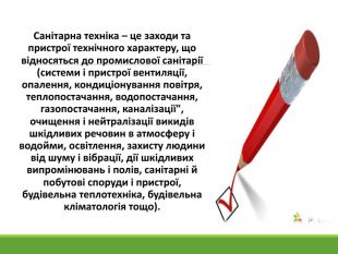 Санітарна техніка – це заходи та пристрої технічного характеру, що відносяться до промислової санітарії (системи і пристрої вентиляції, опалення, кондиціонування повітря, теплопостачання, водопостачання, газопостачання, каналізації", очищення і нейтралізації викидів шкідливих речовин в атмосферу і водойми, освітлення, захисту людини від шуму і вібрації, дії шкідливих випромінювань і полів, санітарні й побутові споруди і пристрої, будівельна теплотехніка, будівельна кліматологія тощо).