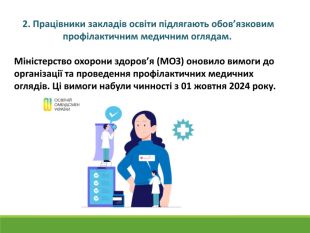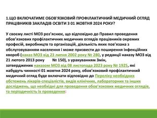 1.ЩО ВКЛЮЧАТИМЕ ОБОВ'ЯЗКОВИЙ ПРОФІЛАКТИЧНИЙ МЕДИЧНИЙ ОГЛЯД ПРАЦІВНИКІВ ЗАКЛАДІВ ОСВІТИ З 01 ЖОВТНЯ 2024 РОКУ? У своєму листі МОЗ роз’яснює, що відповідно до Правил проведення обов’язкових профілактичних медичних оглядів працівників окремих професій, виробництв та організацій, діяльність яких пов’язана з обслуговуванням населення і може призвести до поширення інфекційних хвороб (наказ МОЗ від 23 липня 2002 року № 280, у редакції наказу МОЗ від 21 лютого 2013 року № 150), з урахуванням Змін, затверджених наказом МОЗ від 08 листопада 2023 року № 1925, які набудуть чинності 01 жовтня 2024 року, обов’язковий профілактичний медичний огляд буде включати відповідно до Переліку необхідних обстежень лікарів-спеціалістів, видів клінічних, лабораторних та інших досліджень, що необхідні для проведення обов’язкових медичних оглядів, та періодичність їх проведення: