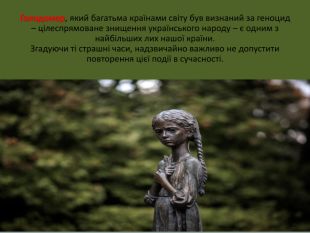 Голодомор, який багатьма країнами світу був визнаний за геноцид – цілеспрямоване знищення українського народу – є одним з найбільших лих нашої країни. Згадуючи ті страшні часи, надзвичайно важливо не допустити повторення цієї події в сучасності.