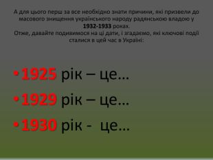 А для цього перш за все необхідно знати причини, які призвели до масового знищення українського народу радянською владою у 1932-1933 роках. Отже, давайте подивимося на ці дати, і згадаємо, які ключові події сталися в цей час в Україні:1925 рік – це…1929 рік – це…1930 рік - це…