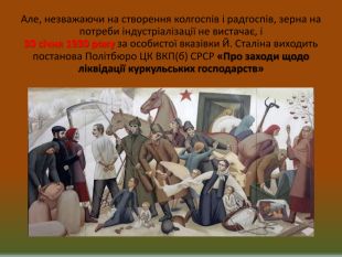 Але, незважаючи на створення колгоспів і радгоспів, зерна на потреби індустріалізації не вистачає, і 30 січня 1930 року за особистої вказівки Й. Сталіна виходить постанова Політбюро ЦК ВКП(б) СРСР «Про заходи щодо ліквідації куркульських господарств»
