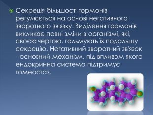 Секреція більшості гормонів регулюється на основі негативного зворотного зв'язку. Виділення гормонів викликає певні зміни в організмі, які, своєю чергою, гальмують їх подальшу секрецію. Негативний зворотний зв'язок - основний механізм, під впливом якого ендокринна система підтримує гомеостаз.
