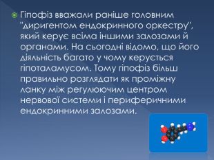Гіпофіз вважали раніше головним "диригентом ендокринного оркестру", який керує всіма іншими залозами й органами. На сьогодні відомо, що його діяльність багато у чому керується гіпоталамусом. Тому гіпофіз більш правильно розглядати як проміжну ланку між регулюючим центром нервової системи і периферичними ендокринними залозами.