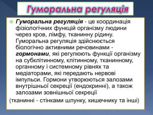 Презентація "Гуморальна регуляція " допоможе учням ознайомитися зі структурою ендокринної системи, з її функціями, Засвоїти, що таке гормони і як вони впливають на організм людини.